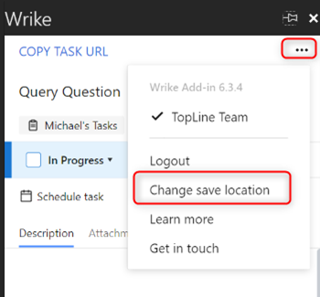 If you would like to change where you are saving the task you can change the default location for all tasks or change it for the individual task you are working on. To change the default location, click on the three dots in the top right of the add-in. Then click on "Change save location".