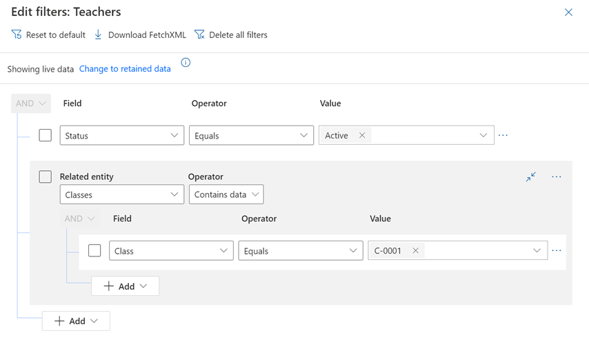 Create a view in Dynamics with the filters you’re looking to apply to the lookup field, including the filter that will be based on another field. In our case, since we want to show active teachers that can teach a chosen class, our filter will look something like this: