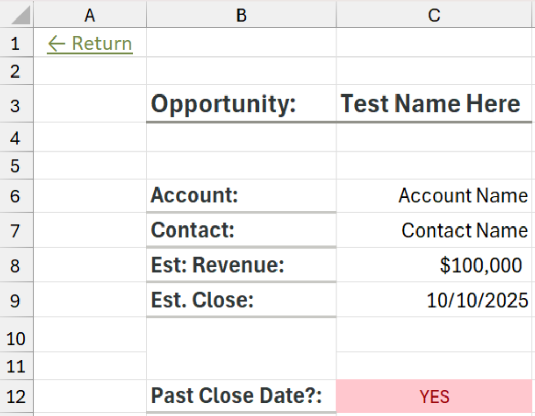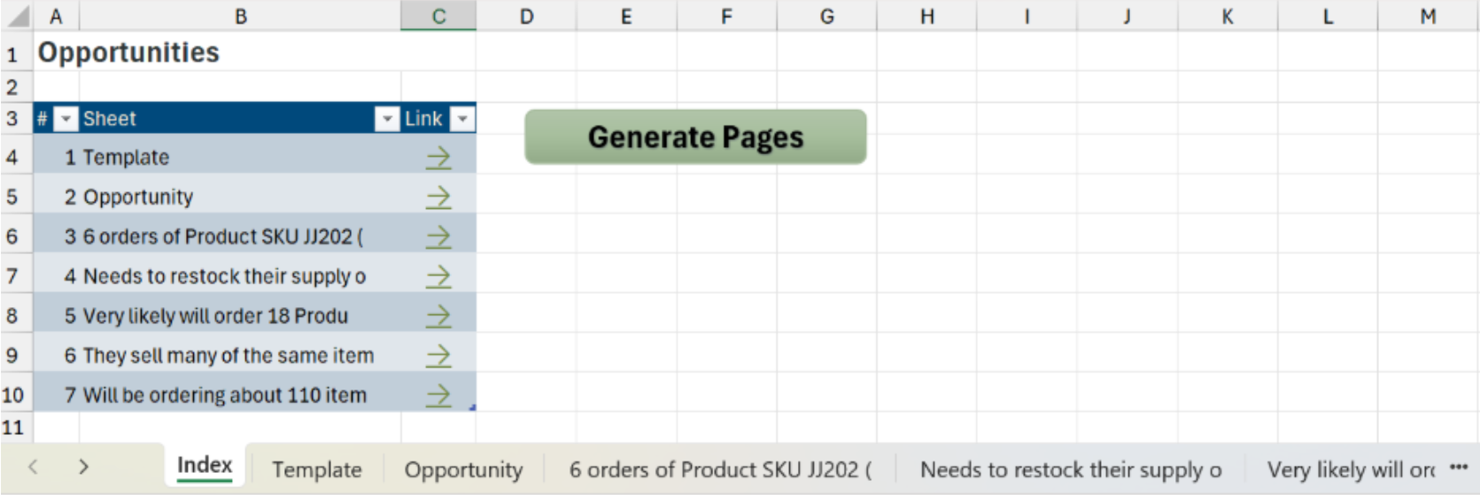 We can then update a navigation page with the name of each Opportunity’s sheet. (Because Excel sheets have a character limit, the names of the Opportunities are truncated.)